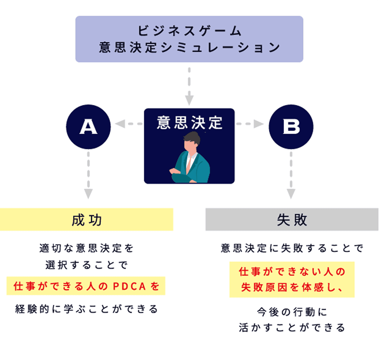 ビジネスゲームには実際の経営や仕事において生じるジレンマが多数仕掛けられています。それらはチームや個人で解決しなければなりません。成功と失敗を分ける意思決定のシミュレーションを繰り返すことで、実業務では得られない速さでPDCAを回すことができます。